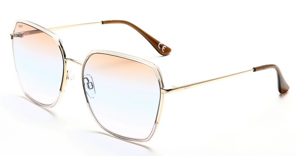 Oversized square sunglasses with gold metal frames and pastel gradient lenses, offered in peach-brown and icy blue for a modern, glamorous touch